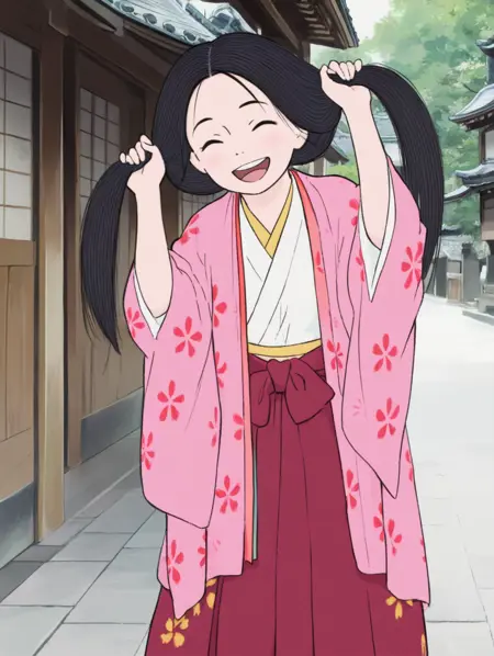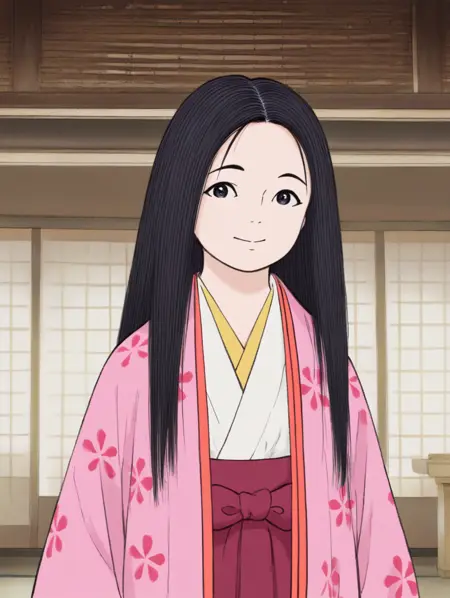 masterpiece,best quality,amazing quality, kaguya, 1girl, solo, long hair, looking at viewer, :), black hair, teen, japanese clothes, white shirt, red skirt, pink kimono, floral print, black eyes, standing, japenese temple, official style
