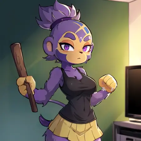 - アクティベーションタグは「Ezili」。補助タグには:solo、short hair、holding、animal ears、purple eyes、tail、purple hair、facial mark、clenched hand、furry、forehead mark、furry female、body fur、animal nose、topknot、stick、two-tone fur