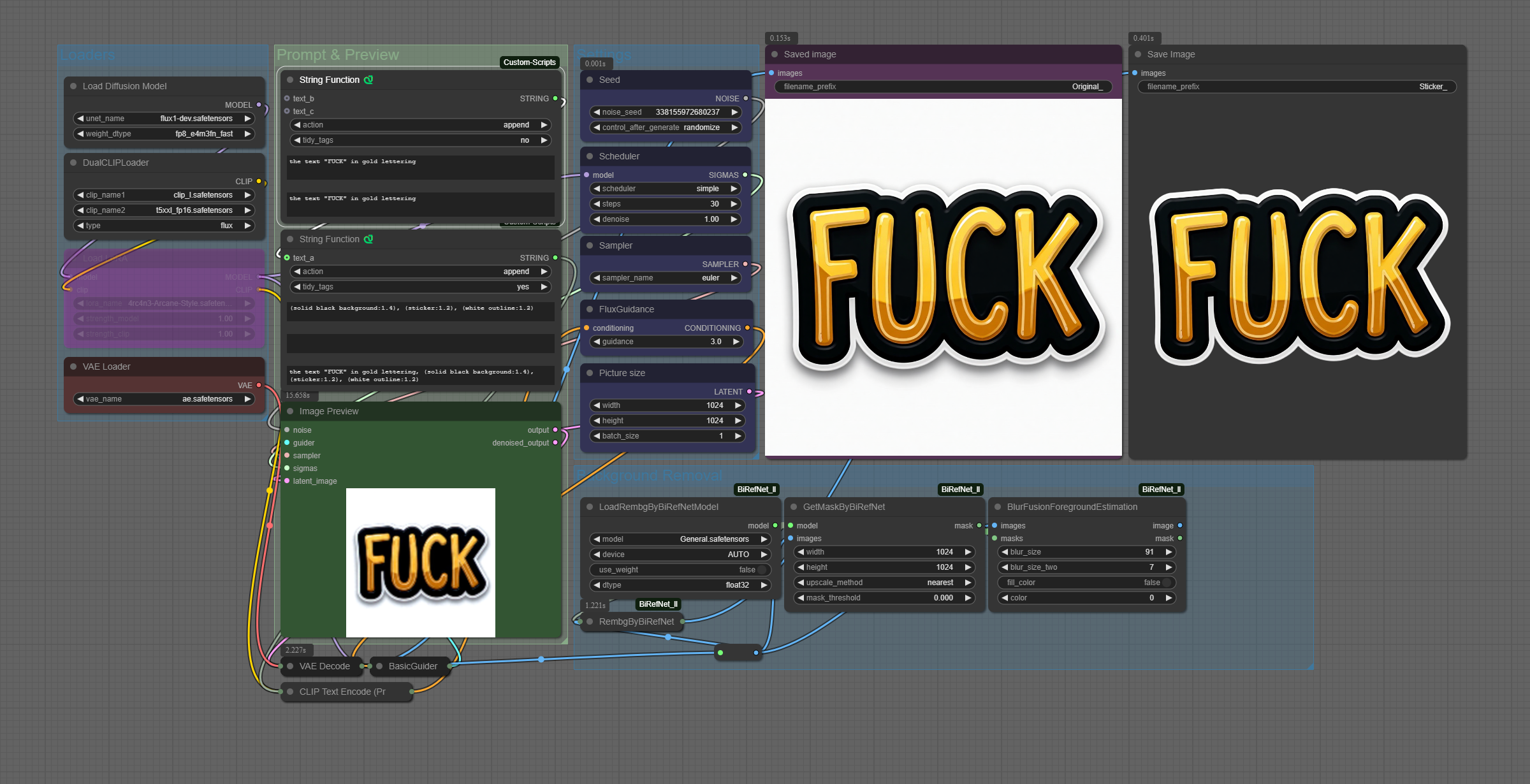 为ComfyUI设计的简单贴纸制作工作流,使用Flux和BiRefNet背景移除模型(可从此处获取)。