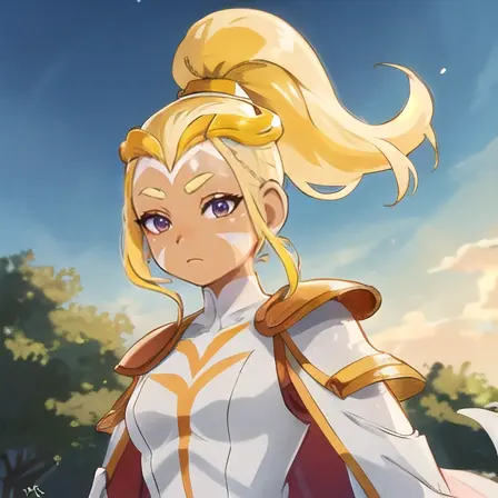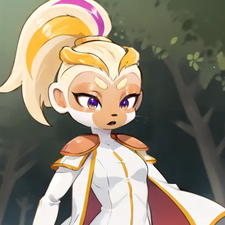 - アクティベーションタグは「Adora」です。他の補助タグ:金髪、紫の目、尾、ポニーテール、ハイポニーテール、肩アーマー、体毛、ツートーン毛並み、キャップ、白いアーマー、黄色い毛並み、トップノット、顔の毛/顔の模様、服を着ている、黄色い肌、多色肌、大人、黄色い髪