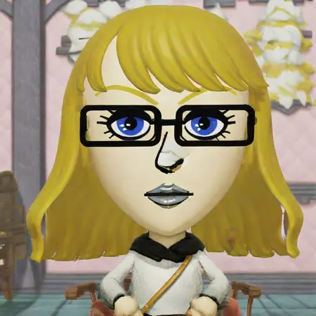 Blonde hair, blue eyes, glasses, grey lipstick makeup