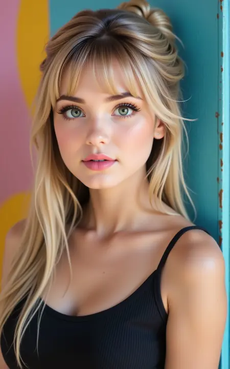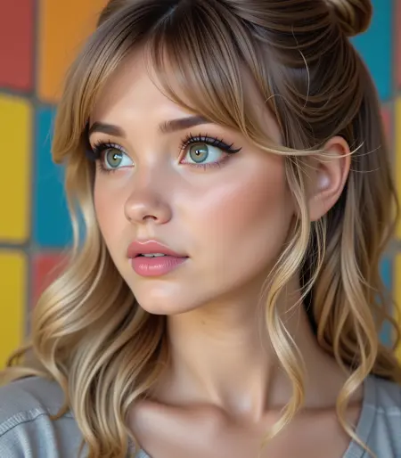 woman, blue eyes, blond, bangs, half updo, heart shaped lips, pink lipstick, long hair,