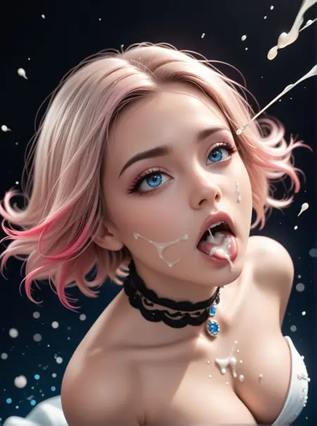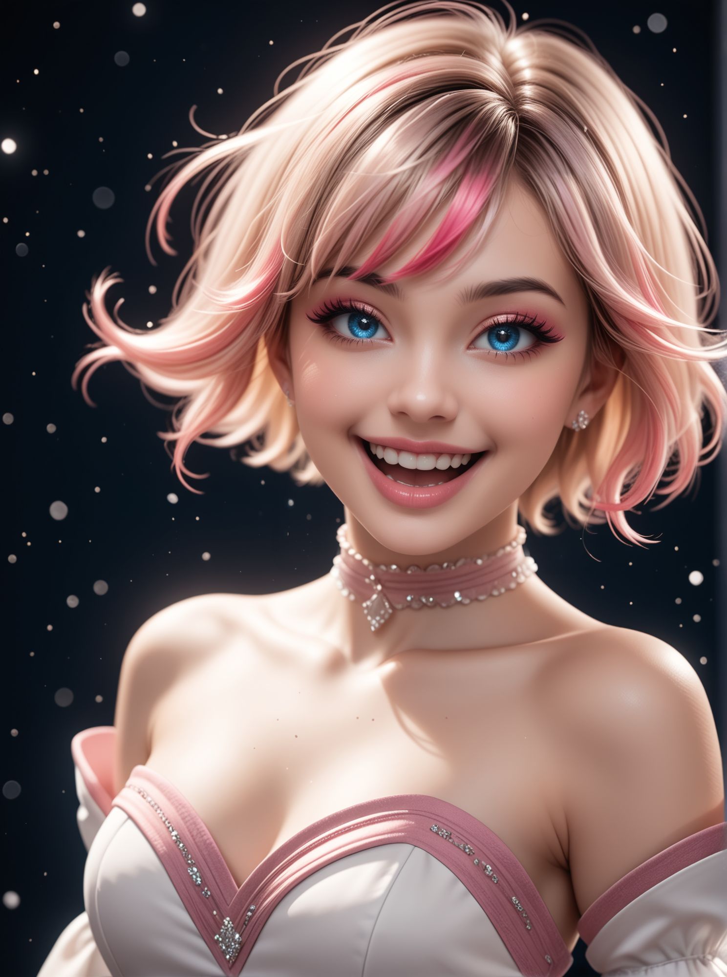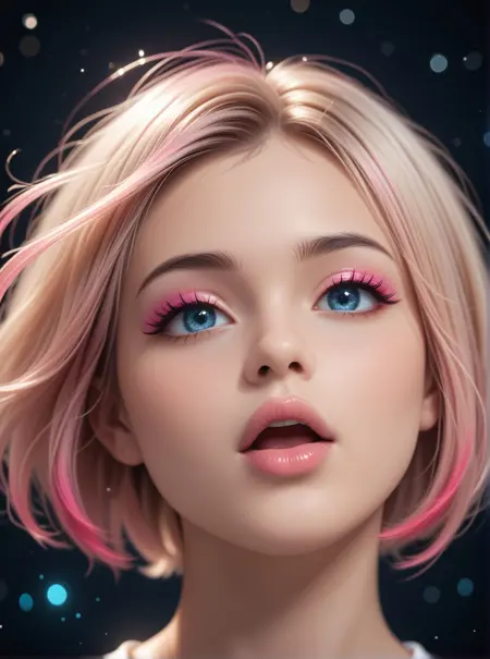 woman, blue eyes, blond, pink highlights, bangs, short hair,