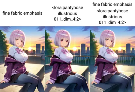 이 LoRA는 "세밀한 직물 강조" 토큰 문자열 대신 또는 그에 추가로 팬티스타킹/티어하이스/다른 의류 항목에 직물 텍스처를 추가해야 합니다. 이외에는 이미지에 거의 영향을 미치지 않아야 합니다.