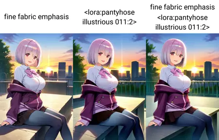 이 LoRA는 "세밀한 직물 강조" 토큰 문자열 대신 또는 그에 추가로 팬티스타킹/티어하이스/다른 의류 항목에 직물 텍스처를 추가해야 합니다. 이외에는 이미지에 거의 영향을 미치지 않아야 합니다.
