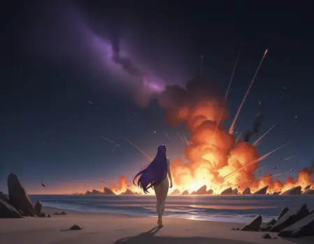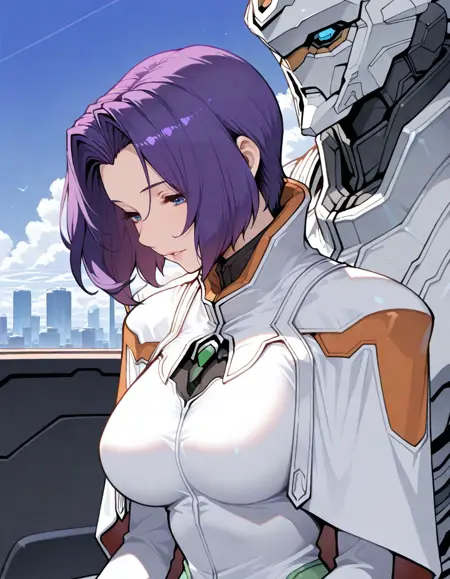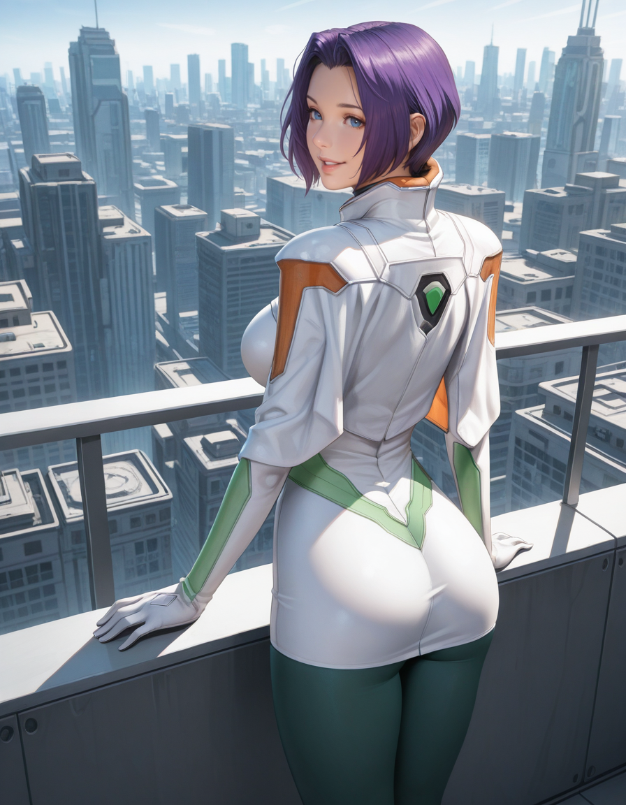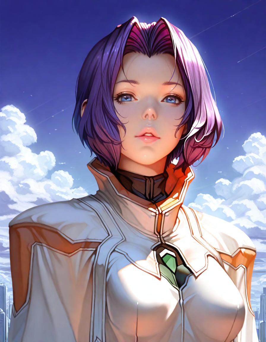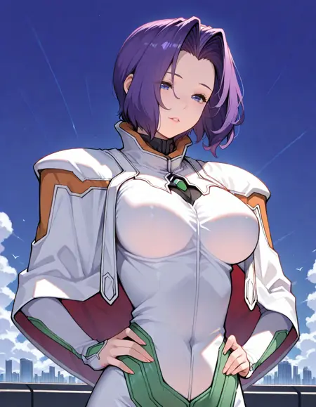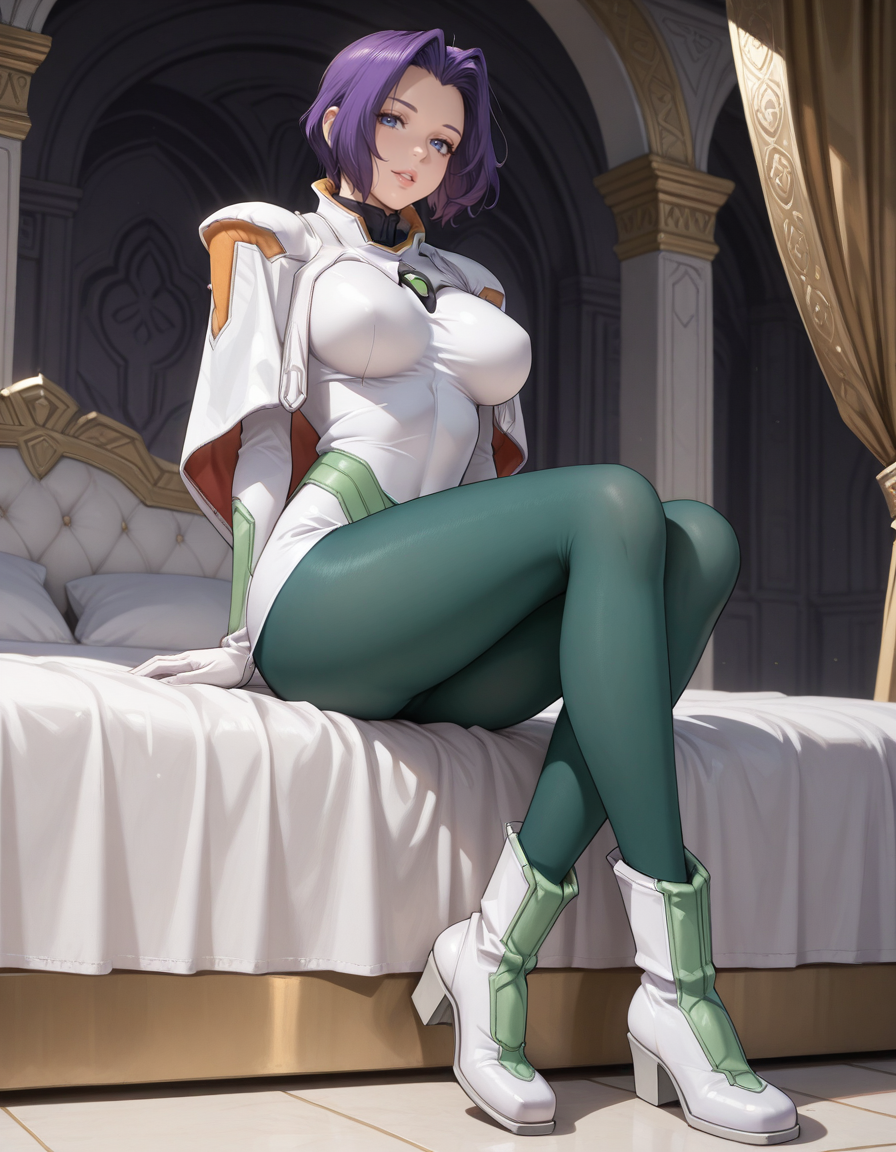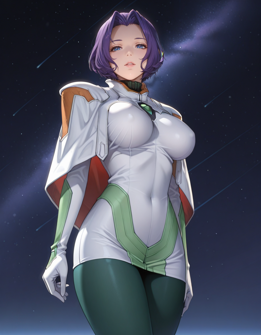 基本プロンプト: 1girl, miang_xenogears, short hair, purple hair, parted lips, blue eyes, green pantyhose, white boots,