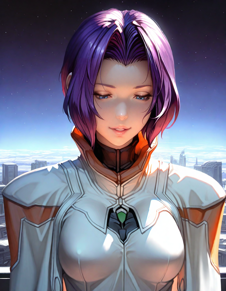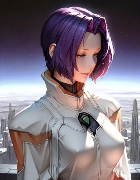 プロンプト例: 1girl, miang_xenogears, short hair, purple hair, parted lips, blue eyes, green pantyhose, white boots, Full body, Anime Spaceship, indoor, large corridor, big windoew, futuristic
