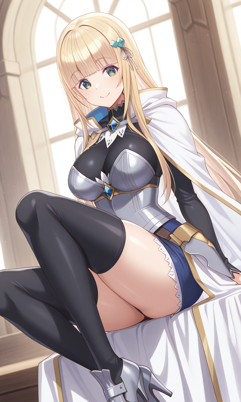 oreaku_tia, blonde hair, long hair, green eyes, hair ornament, straight hair, blunt bangs, long bangs, medium breasts, blue miniskirt, white cape, black thighhighs, high heels, long sleeves, armor, breastplate, boobplate,