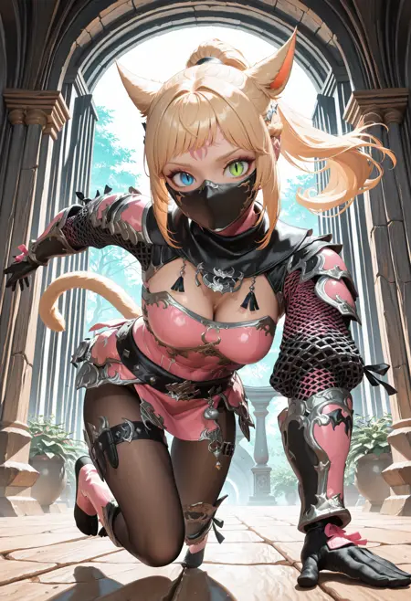 Ninja is another job that has an aesthetic I love. I did a bit of a mix with this one, I took the Mask from the second stage armor instead of the original full head covering of the first stage. I like to be able to see the hair styles, I think they match pretty well though so I doubt any non Final Fantasy XIV player would notice.