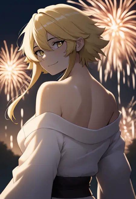 默认外观: le0ne, 金色头发,短发带长发缕,侧发,黄眼睛,黑色胸罩,白色袖子,蓬松的独立袖子,白色长裤,马裤,黑色内衣,棕色腰带,腰带扣,露肩,乳沟,大乳房