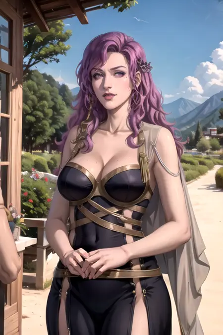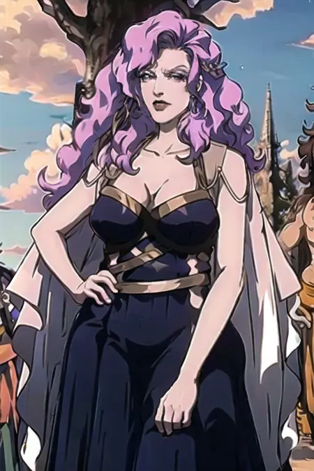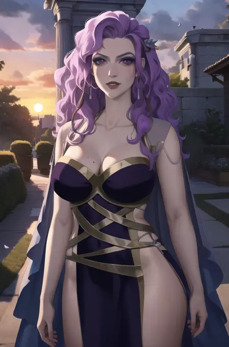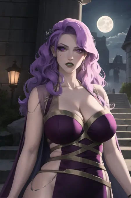 1girl, long hair, purple hair, breasts, cleavage, purple eyes, large breasts, makeup, lipstick, mole under eye, wavy hair, black lips,