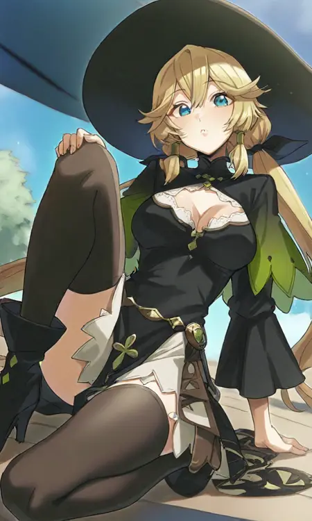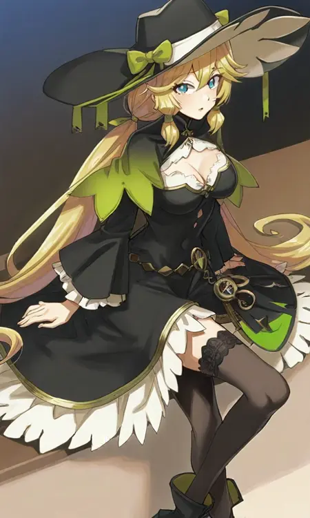 infgch_ellie, 금발, 긴 머리, 낮은 트윈테일, 묶인 측면 머리카락, 청록색 눈, 중간 크기의 가슴, 흑색 드레스, 젖은 가슴선 컷아웃, 이톤 스커트, 하이-로우 스커트, 녹색 캐프레트, 흑색 하이힐 부츠, 앵클 부츠, 흑색 투어하이 스타킹,