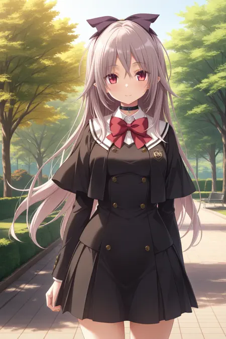 校服, 黑色项圈, 红色领结, 长袖, 白色衬衫, 黑色连衣裙, 黑色小斗篷, 黑色夹克,