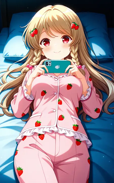 blonde hair, strawberry hair ornament, twin braids, hair bobbles, hair down, long hair, red eyes, medium breasts