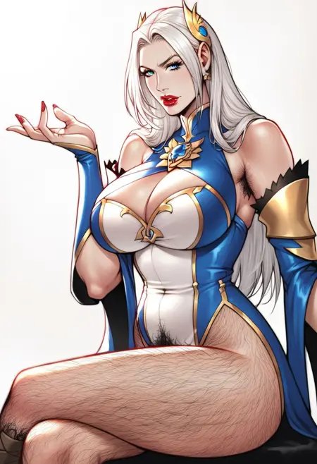 Character: Frankie, red nails, long hair, white hair, big breasts, thicc thighs, red lips, blue eyes,
