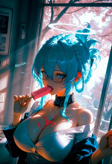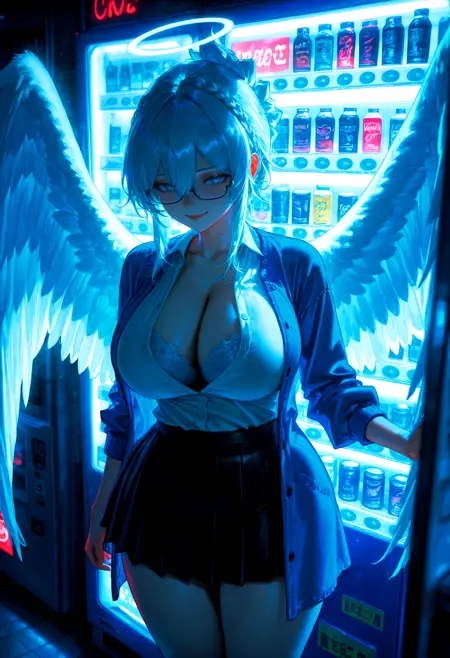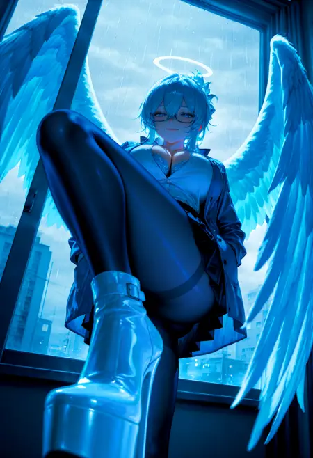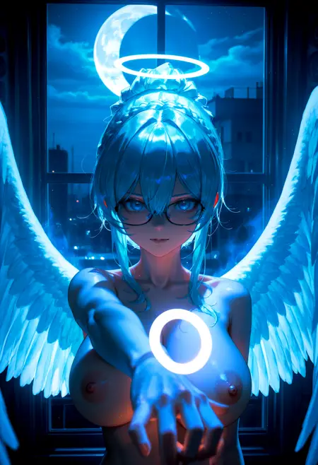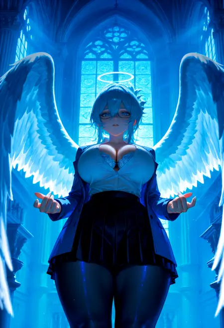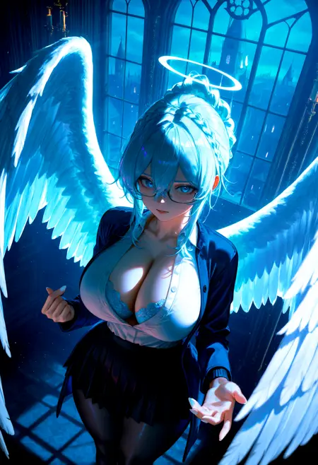 1girl, halo, blue eyes, light blue hair, folded ponytail, braid, bangs, hair between eyes, sidelocks, huge breasts, (thick thighs:1.3), wide hips, angel wings, feathered wings, glasses, semi-rimless eyewear,