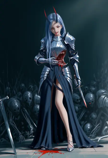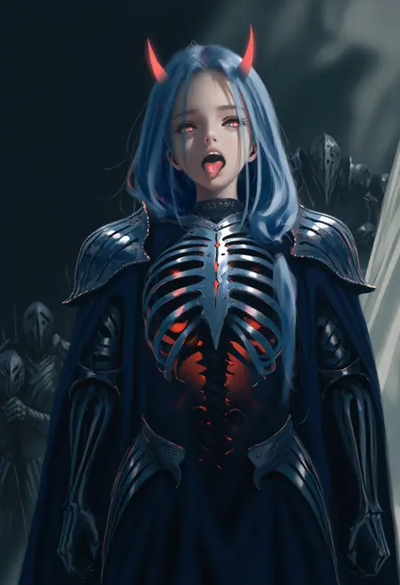 wlop,1girl,:@,glowing red eyes,knight,dagger,long blue hair,tongue out,oni horns,