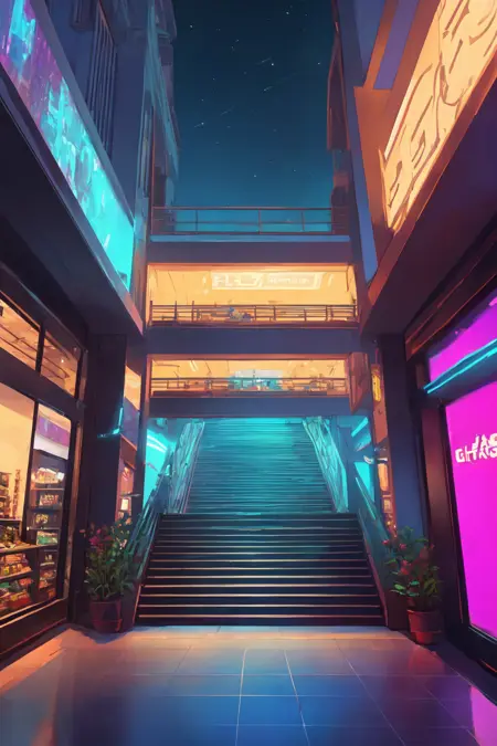 (杰作), (最佳插画), (无人物), 动漫背景, 购物中心, 环形灯, 轮廓光, (极度细致的 CG Unity 8K 壁纸), (杰作), (最佳质量), (超细致), (最佳插画), (最佳阴影), 完美光线, 完美解剖结构, 鲜艳色彩, BgAniDusk