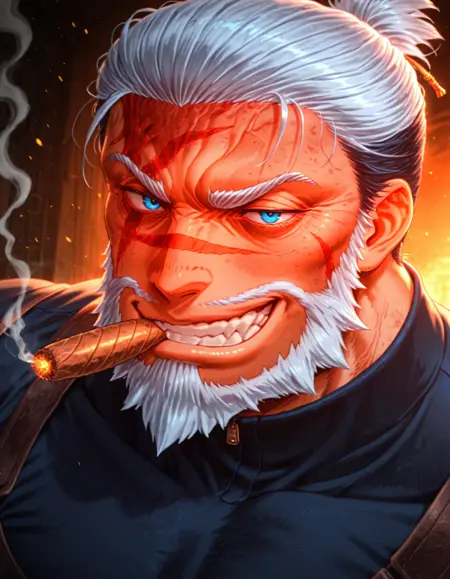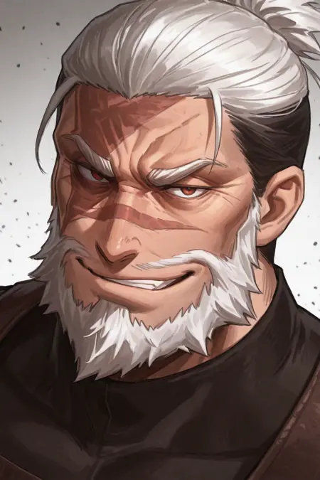 leonidas_ror, 1boy, solo, facial hair, mature male, scar on face, white hair, two-tone hair, black shirt, harness, blue camouflage pant, combat boots