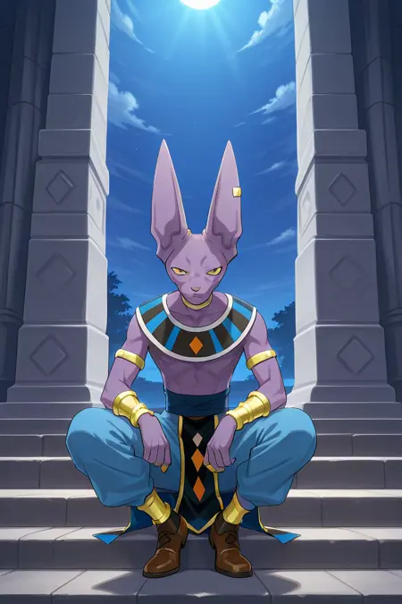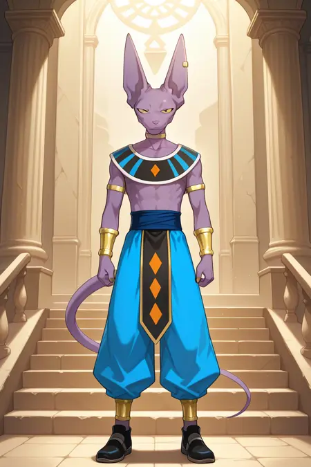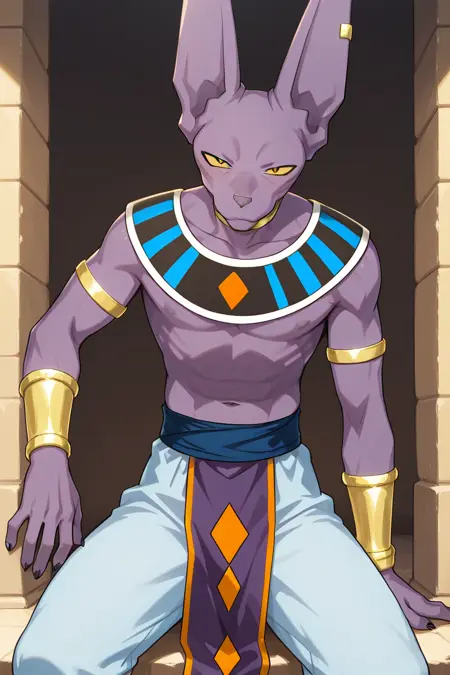 Alone, male, furry, anthropomorphic, adult, beerus, sphinx cat, purple fur, long ears, feline eyes, Egyptian clothing, light blue pants, dark blue sash, gold bracelets, gold necklace, gold bracelets