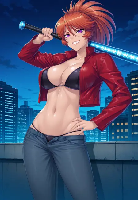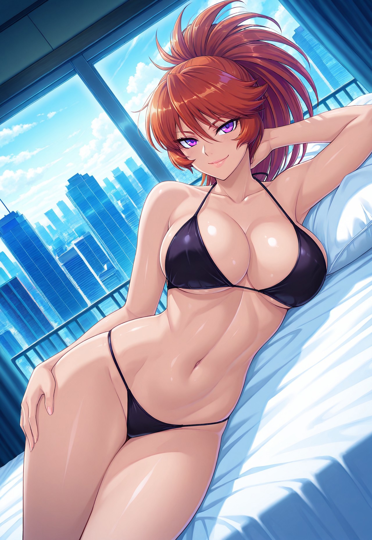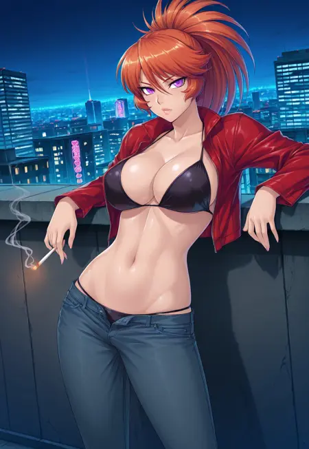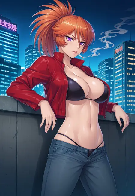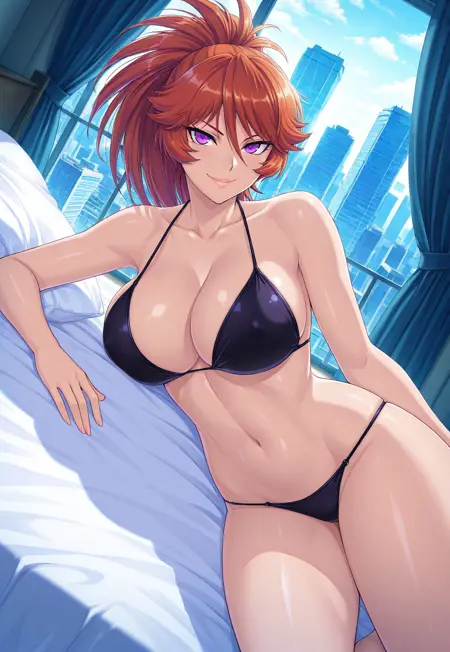 Tags: Kamimura Azuma, long hair, orange hair, ponytail, purple eyes, lips, large breasts, wide hips, curvy