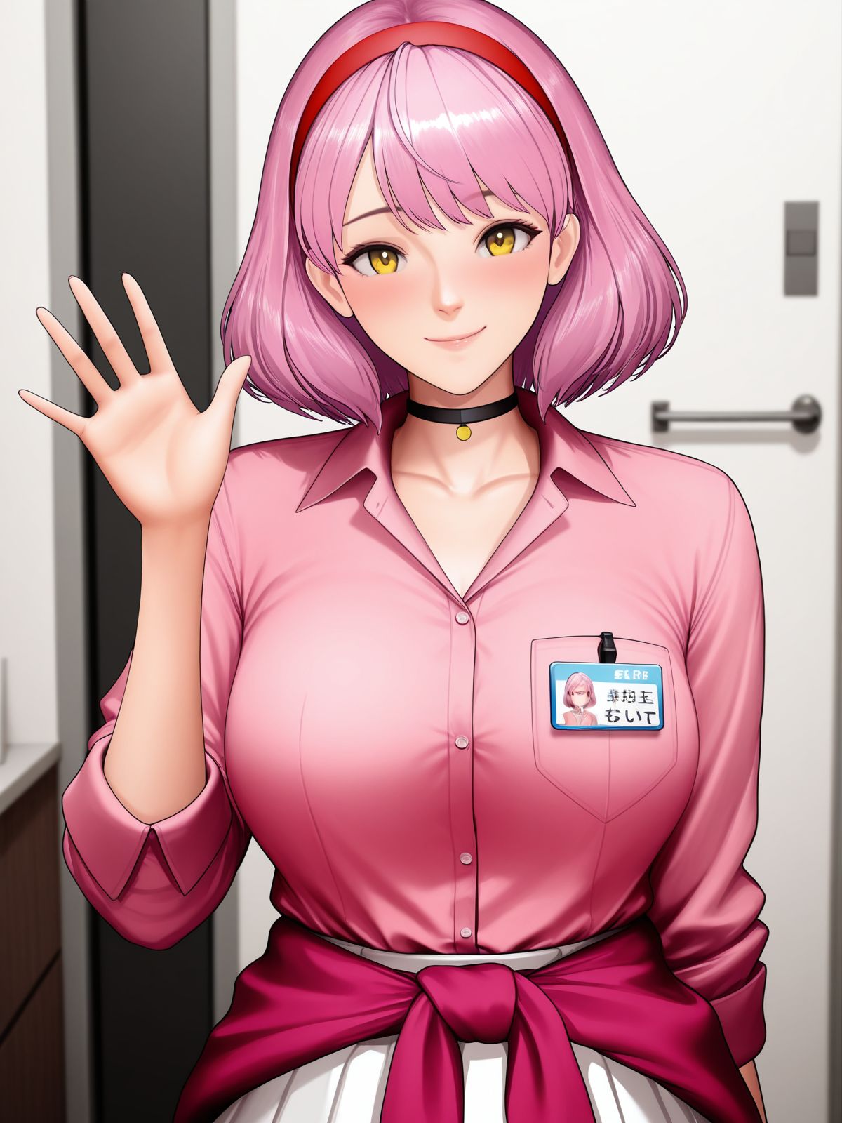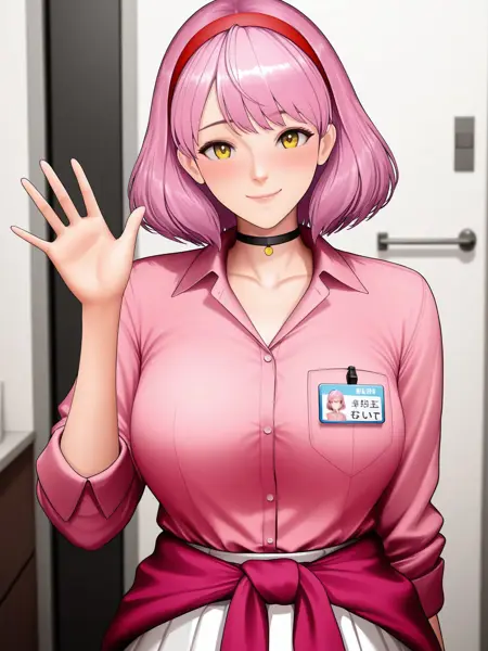 NNell, short pink hair, red headband, yellow eyes, pink shirt, white skirt, red waist-tied sweater