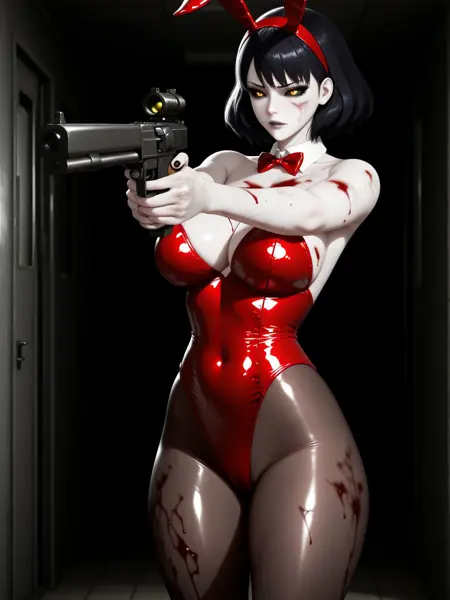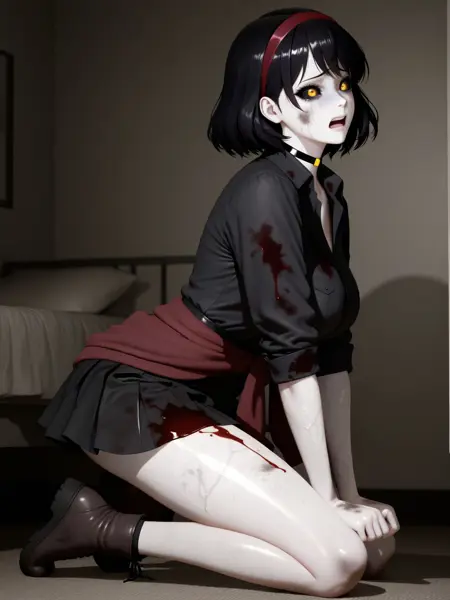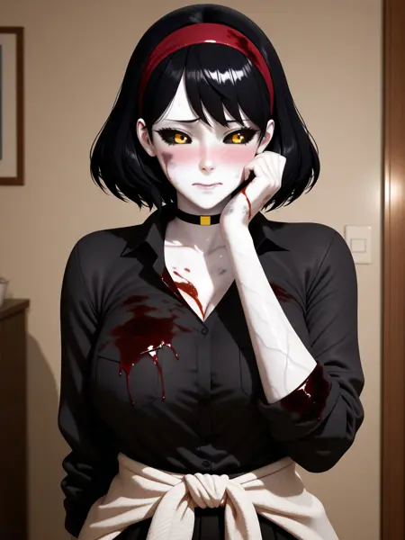 CNell, short black hair, red headband, yellow eyes, black sclera, pale skin, dark blue veins, dirty skin, bloodstained clothing, black shirt, black skirt, white waist-tied sweater