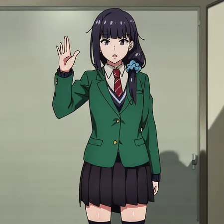 带绿色校服触发词:MisuruGreenSchool, 1girl, 校服,百褶裙,红色领带,黑发,黑色袜子,发圈,外套,过膝袜,长发,西装外套,齐刘海,发饰,黑色裙子,黑眼,毛衣,侧马尾,蓝色发圈,牛仔镜头
