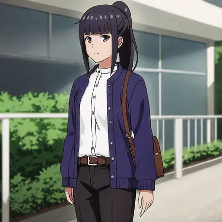 带深蓝色夹克触发词:MisuruDarkBlueJacket, 马尾,斜挎包,黑发,1girl,腰带,衬衫,齐刘海,长发,黑色长裤,侧发,黑眼,夹克,敞开式服装,长袖,牛仔镜头