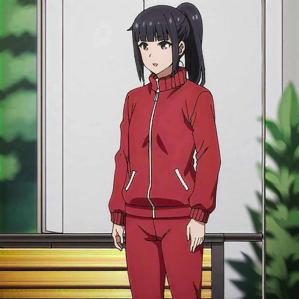 带运动服触发词:MisuruTracksuit, 1girl,运动服,黑发,马尾,运动夹克,红色夹克,运动裤,鞋底,齐刘海,黑眼,长发,红色长裤,长袖,牛仔镜头