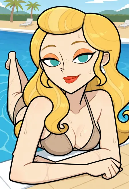 1girl, solo, Anastasia_DC_IL, 苍白皮肤, 海蓝眼睛, 金发, 长波浪发, 雀斑, 橙色眼影, 红唇, 白色耳环
