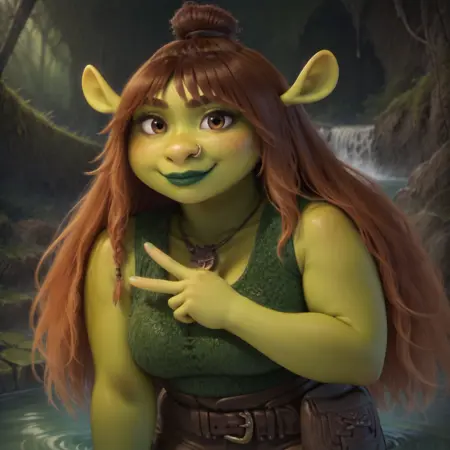 Positive Prompts: FeliciaS5, female humanoid, ogre, ogre ears, brown hair tie, brown eyebrows, amber hair, braid, long hair, brown eyes, black pupils, freckles on face, silver nose piercing, green lipstick, green body, green skin, slightly chubby female
