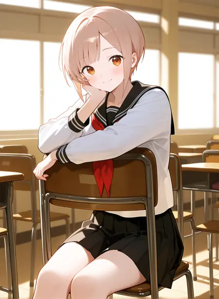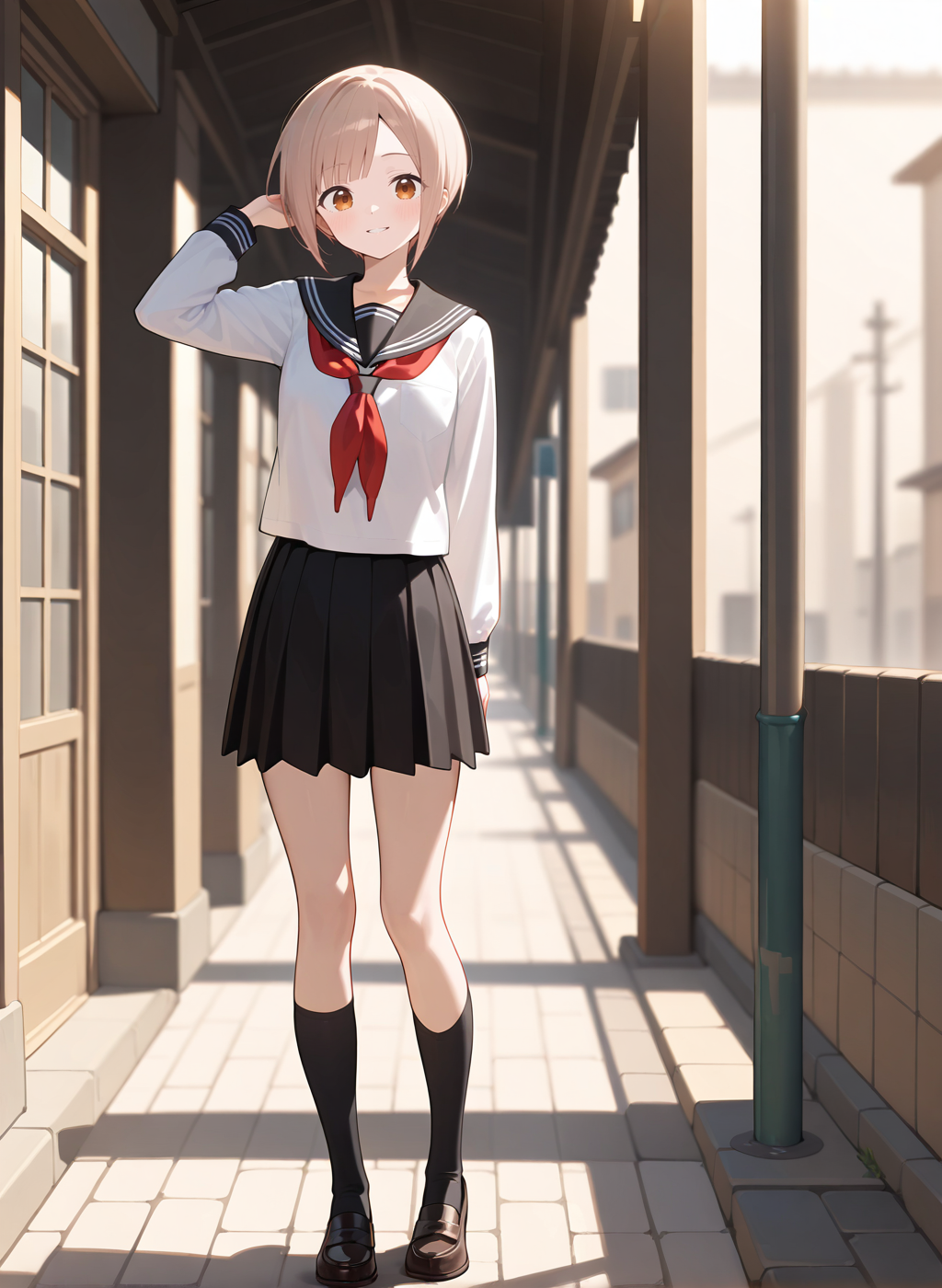 school uniform, serafuku, white shirt, black sailor collar, red neckerchief,pleated skirt