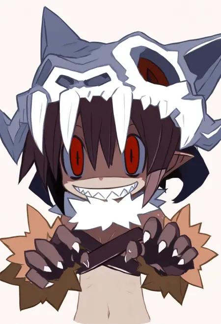 角色:1个女孩,萨满(Disgaea),头骨,黑发,红眼,深色皮肤