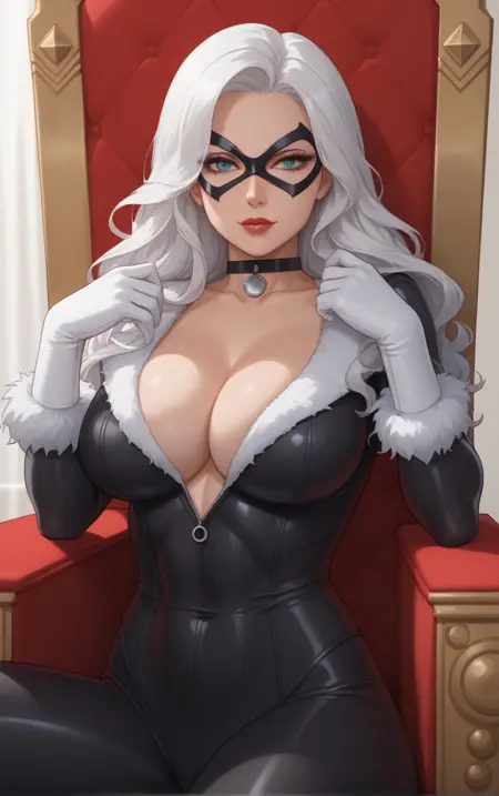 black bodysuit, fur-trimmed sleeves, fur trim, skin tight, white gloves, spikes, superhero, bodysuit, black choker, collar, cleavage, gloves, elbow gloves, long sleeves, covered navel,