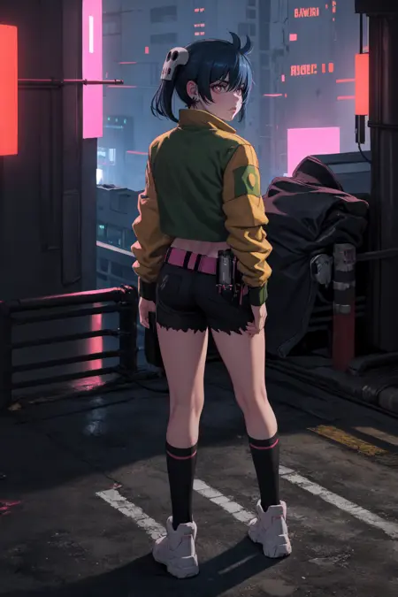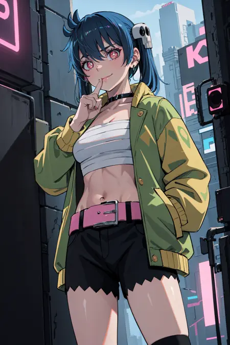 Main outfit "toned, bandaid on cheek, open jacket, green jacket, pink belt, black shorts, single bandaid on knee, kneehighs, black choker, sarashi, midriff".