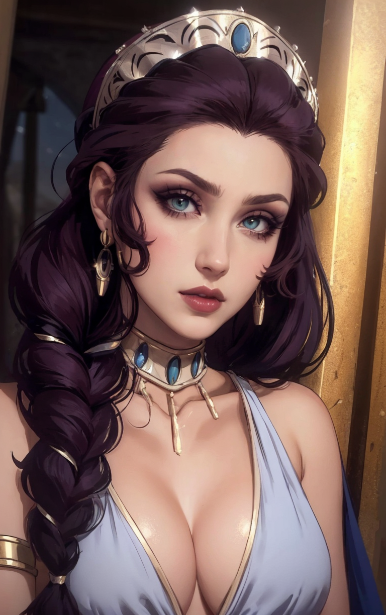 - 1girl, single braid, long hair, black hair, purple hair, makeup, lipstick, large breasts, medium breasts, crown, earrings, jewelry, hair over shoulder,