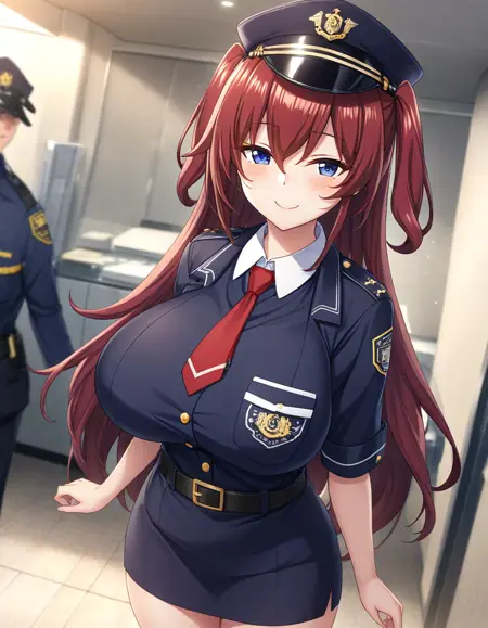 Ayane Ousaka, blue eyes, red hair, long hair, two side up, hair ribbon, hair ornament, bang, large breasts,