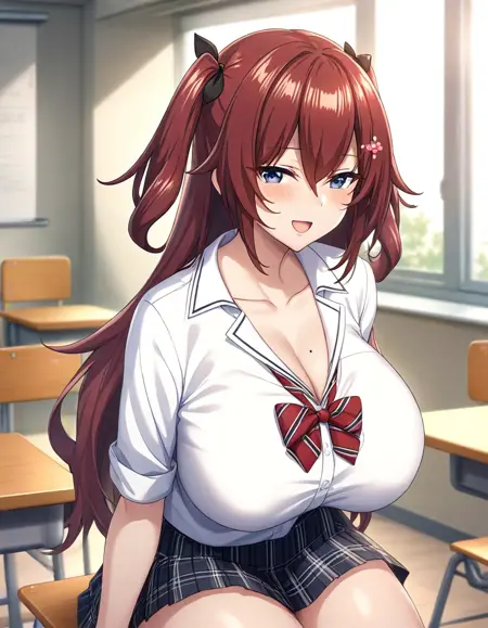 Recommend Prompt:Ayane Ousaka, blue eyes, red hair, long hair, two side up, hair ribbon, hair ornament, bang, large breasts,
