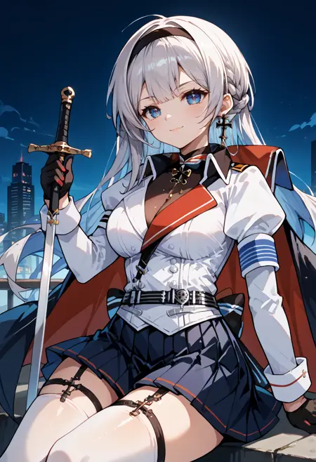 zzmainza, 1girl, zzmainznormal_outfit, 蓝眼睛, 灰色头发, 长发, 胸部, 刘海, 裙子, 大胸, 过膝袜, 手套, 长袖, 持握, 乳沟, 饰品, 闭嘴, 夹克, 发辫, 武器, 白发, 百褶裙, 发带, 耳环, 黑色手套, 蓬松袖子, 剑, 超短裙, 黑色裙子, 斗篷, 持武器, 白色过膝袜, 大腿绑带, 吊袜带, 持剑, 白色夹克, 十字架, 黑色发带, 朱丽叶袖, 鞘, 黑色斗篷, 半手套, 十字耳环, 拔剑