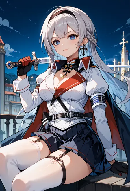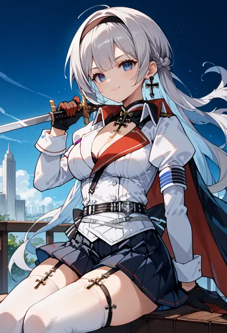 zzmainza, 1girl, zzmainznormal_outfit, 파란 눈, 회색 머리, 긴 머리, 가슴, 앞머리, 치마, 큰 가슴, 허벅지 스타킹, 장갑, 긴 소매, 손에 들고 있음, 가슴선, 보석, 입 닫음, 재킷, 땋은 머리, 무기, 흰 머리, 주름 치마, 헤어밴드, 귀걸이, 검은 장갑, 불룩한 소매, 검, 미니 치마, 검은 치마, 망토, 무기 들고 있음, 흰 허벅지 스타킹, 허벅지 스트랩, 가터 스트랩, 검 들고 있음, 흰 재킷, 십자가, 검은 헤어밴드, 줄리엣 소매, 검은 망토, 반장갑, 십자가 귀걸이, 검을 뽑는 중