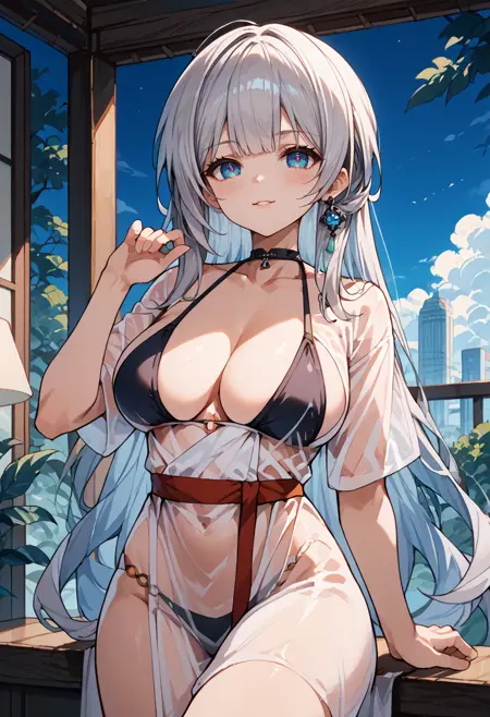 zzmainzc, 1girl, zzmainzsilkiestbrew_outfit, 蓝眼睛, 灰色头发, 长发, 红色肩带, 单耳环, 胸部, 脸红, 刘海, 大胸, 衬衫, 连衣裙, 乳沟, 饰品, 极长发, 站立, 锁骨, 泳装, 白发, 短袖, 比基尼, 耳环, 嘴唇微张, 白色连衣裙, 透明, 黑色比基尼, 吊带式, 比基尼在衣服下