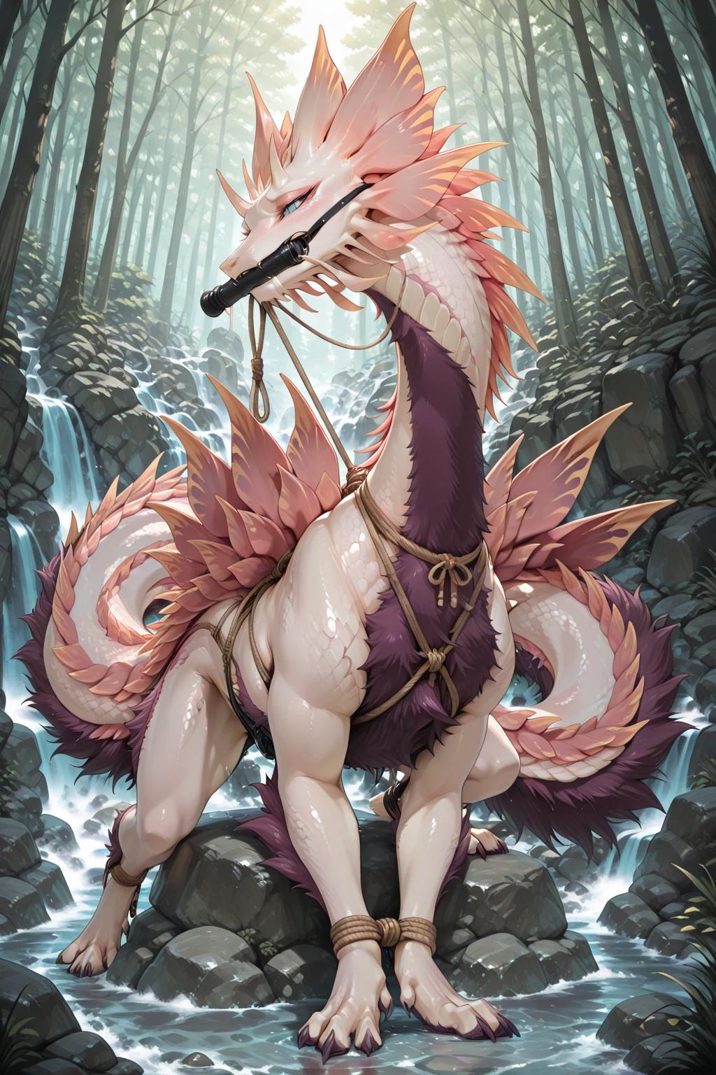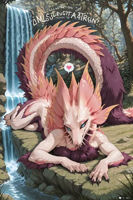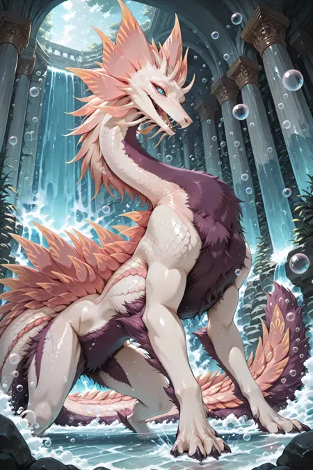 안트로, 푹신한 털, 긴 수염, 흐르는 머리카락, 비누 거품, 포유류 귀, 드래곤 꼬리, 발톱, 근육질이면서 우아한 체형
