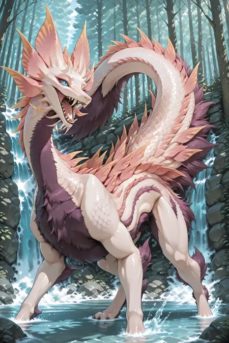 quadruped body, elegant dragon-like form, flowing mane, soap bubbles, long whiskers, glowing eyes, scaled body