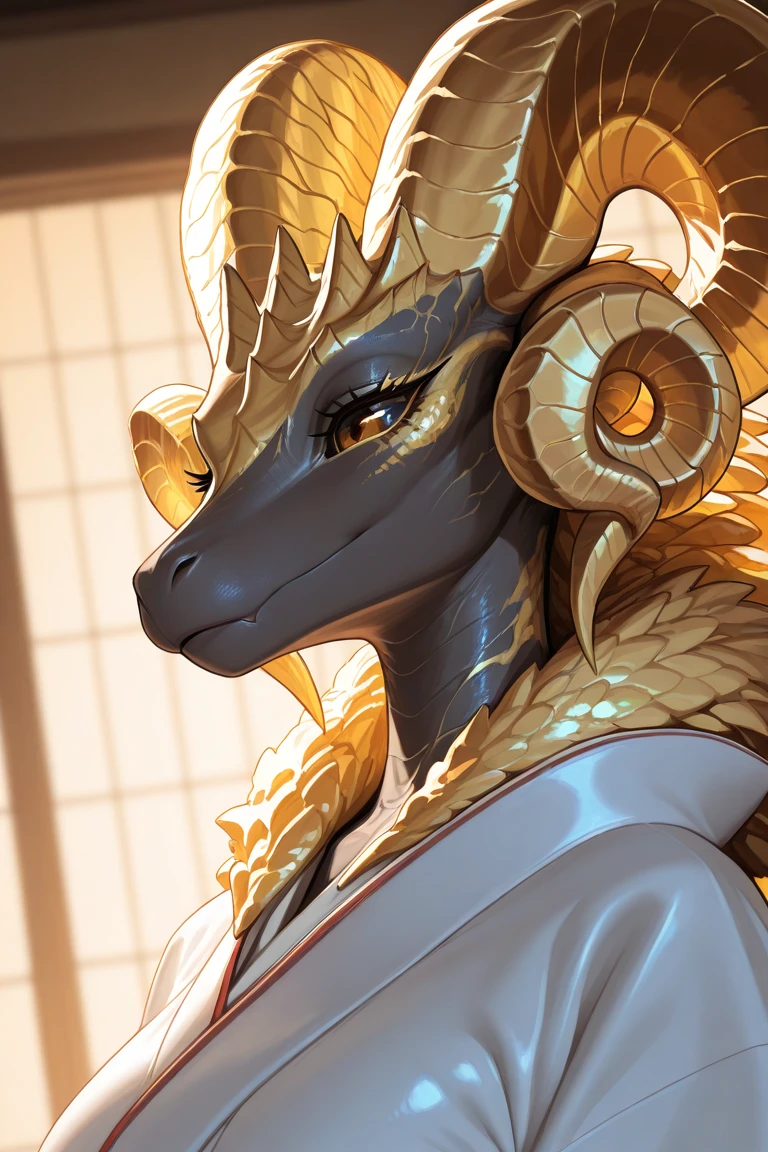 Kulve Taroth, anthro, furry female, golden scales, black skin, horns, dragon tail, thick thighs, heavy body, dark grey body, claws, large breasts, glowing yellow eyes, regal dragon girl, scales detail, sharp teeth
