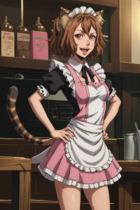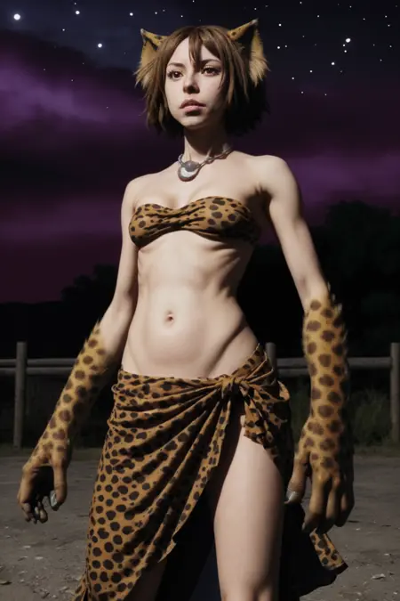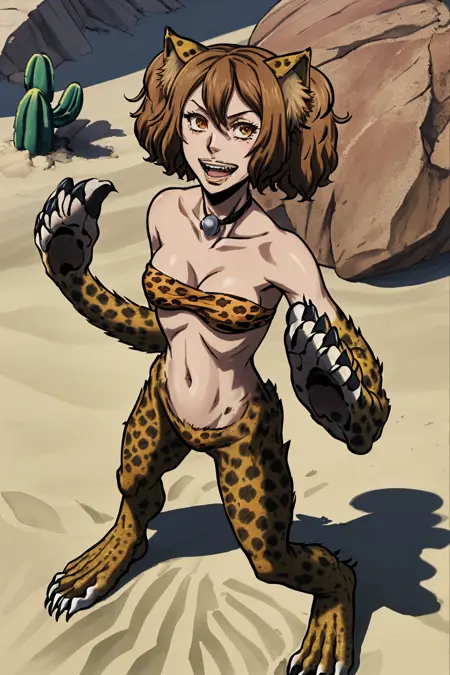 ブラットチーター衣装:animal ears, animal hands, animal print, bare shoulders, brown hair, midriff, monstergirl, navel, necklace, red eyes, short hair, skirt, tail