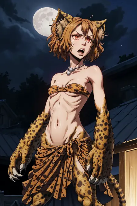 完全猎豹装束:动物耳朵, 动物手掌, 动物纹路, 裸露肩膀, 棕色头发, 露脐, 怪物女孩, 肚脐, 项链, 红色眼睛, 短发, 裙子, 尾巴