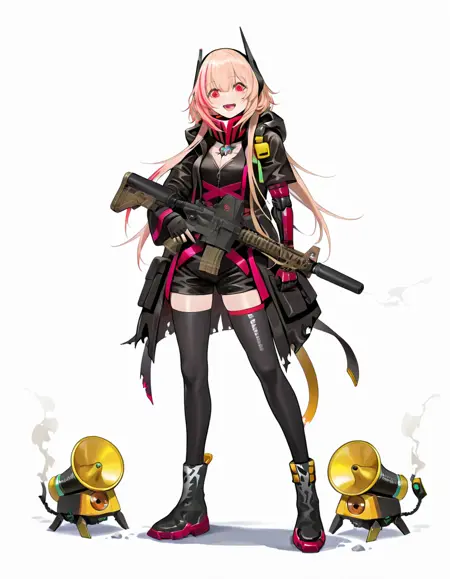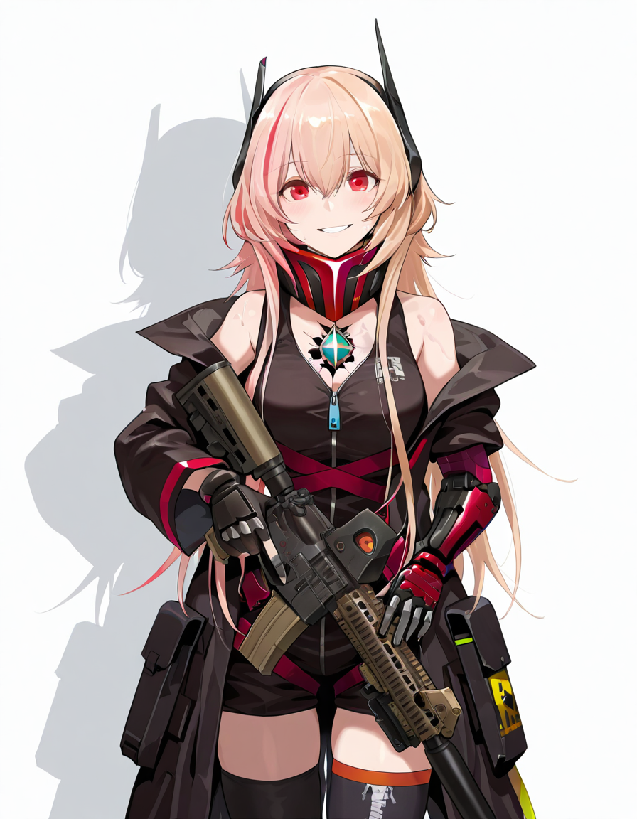 SopmodMOD3, MOD3_short_jumpsuit, MOD3_coat, MOD3_battle_mask, MOD3_chest_jewel, MOD3_coat_straps,single mechanical arm, m4 carbine, MOD3_headgear, MOD3_single_glove, MOD3_thighhighs, MOD3_boots