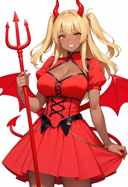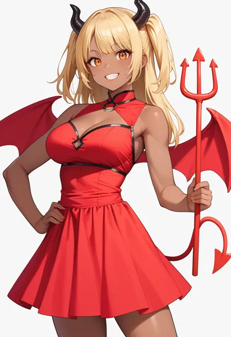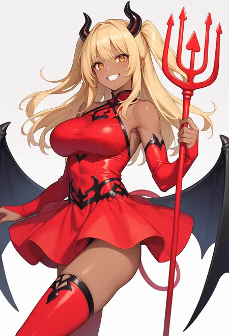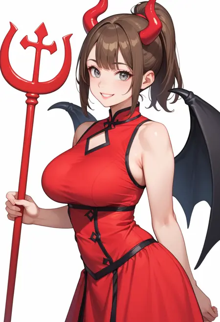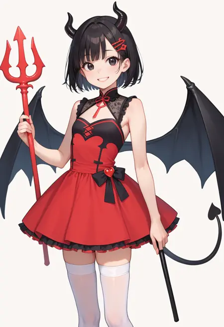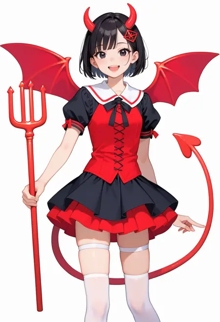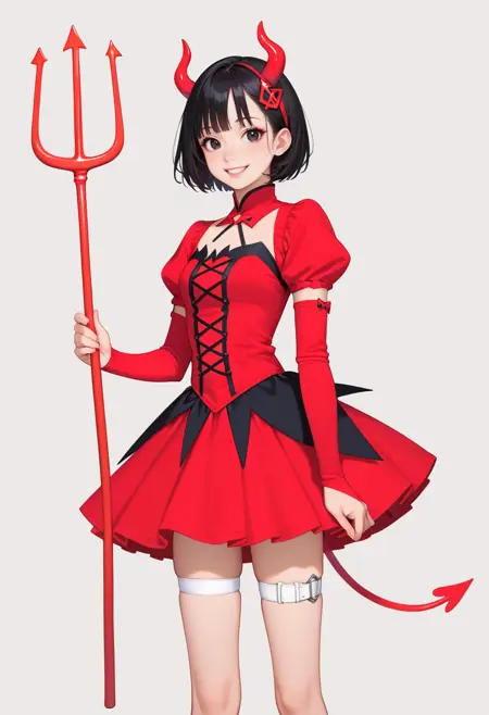 这个LoRA可能会生成一位身着经典恶魔cosplay服装、手持红色三叉戟的少女。