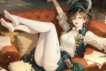 recoleta_\(reverse:1999\), recoleta-def, green eyes, hat, hat feather, short hair, brown hair, hair between eyes,single_earring,mole under eye, white shirt, open vest, green cape, tassel, belt, white pantyhose, boots,black shorts,